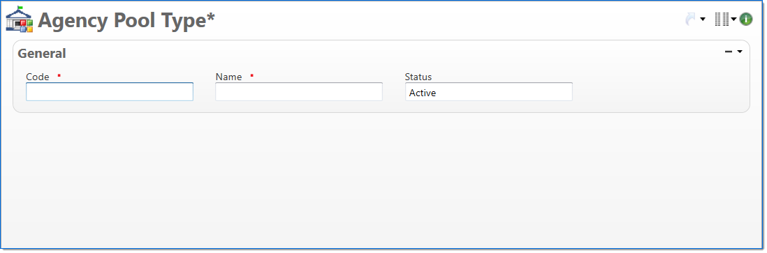 The Agency Pool Type screen allows you to establish a code and name that represents a type of Agency Pool. Agency Pool Type is required on an Agency Pool Schedule Pool. This code and name can be used to assign the same pool type to multiple Agency Pool Schedule Pools.