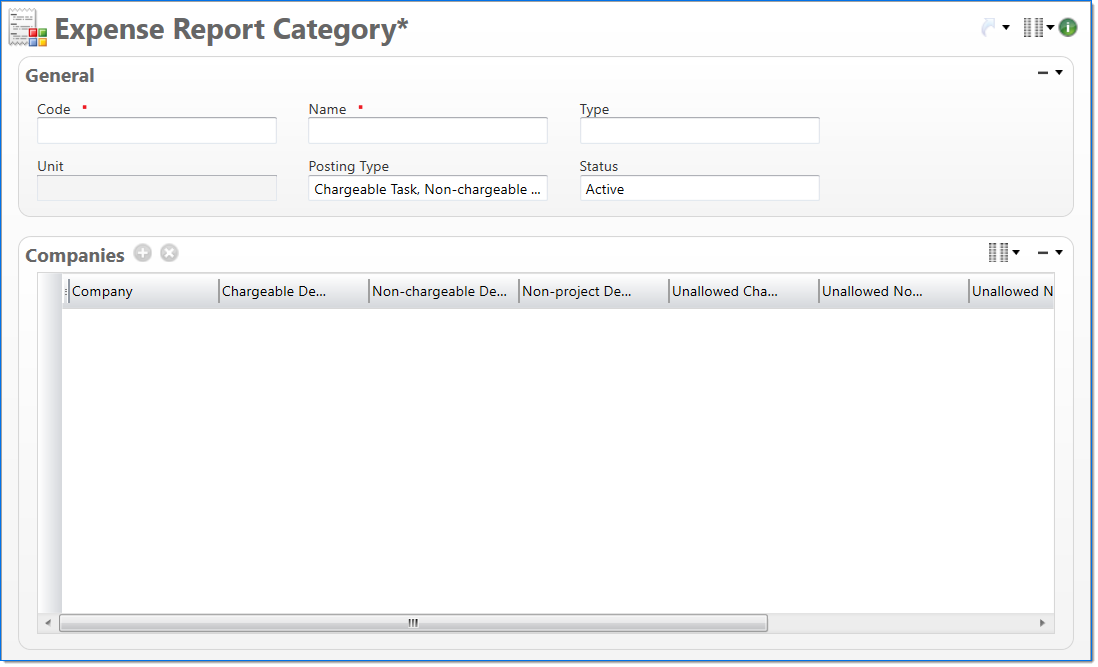 Select one or more posting types to control if the category can be used for project and non-project related expenses. Available options include all, Chargeable Task, Non-Chargeable Task, and Non-Project. This selection is applied to all companies using the category and controls which accounts are required in the Companies area. By default, all posting types are selected. Once the document has been submitted to final, this value cannot be edited. If Type is set to Company Unit, this field is read only. For labor type units, only Chargeable Task and Non-Chargeable Task are available options. |