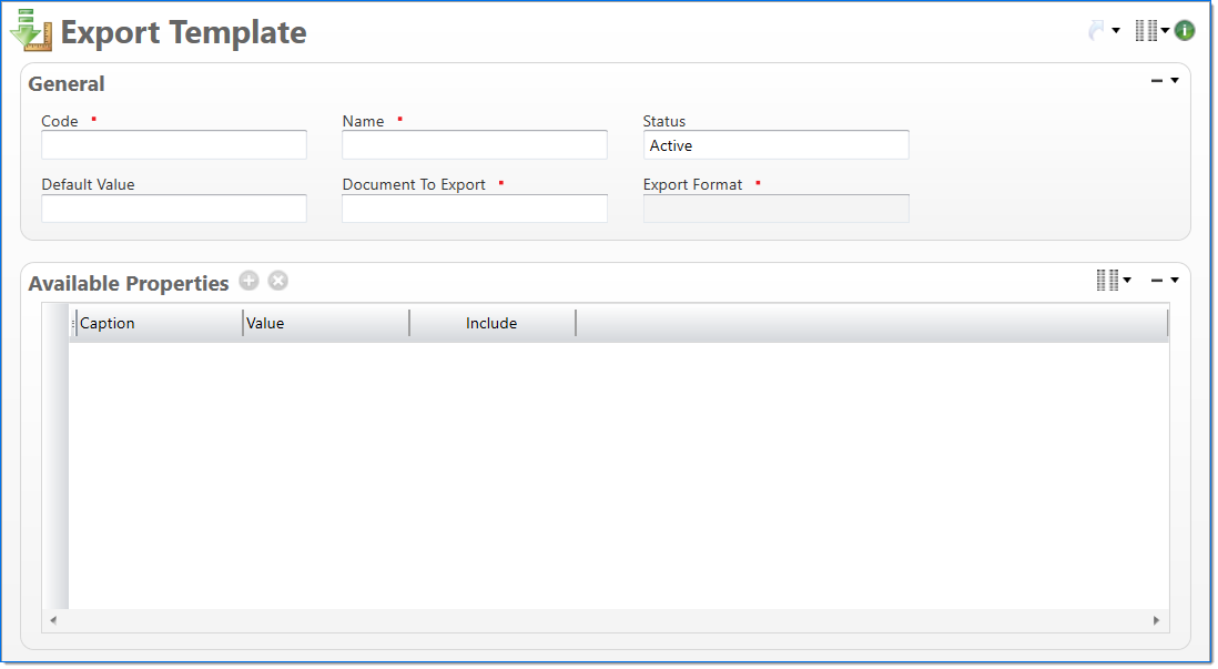 The Export Template screen allows you to create a template of the columns to use when you export data with Export Request. The template is based on a specific Document To Export and Export Format, and it allows you to select the columns to include or exclude, change the order of the columns, and add custom columns with corresponding default values.