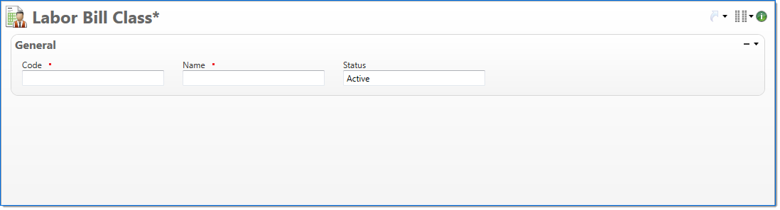 The Labor Bill Class screen allows you to add and define employee time classifications. An employee's time is assigned to a labor bill class unless overridden during timesheet input. Billing rates can then be assigned to employee charged time based on the classifications.