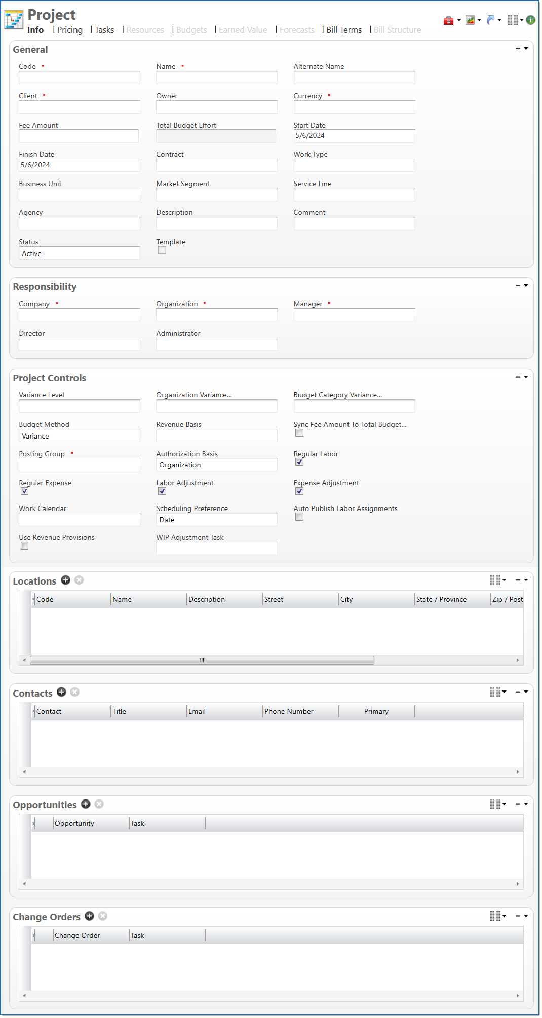 | Service Line | Enter or select an active service line. This is used to categorize and classify projects for reporting purposes. | |||||