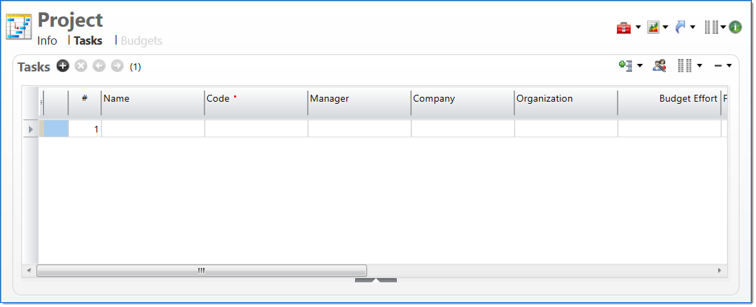 The Tasks tab allows you to define the work breakdown structure for the project. This is a hierarchical structure of tasks that specify how the work will be completed for the project. When adding a project, the Tasks list is automatically populated with a row representing the project level (Task 1). This task may not be deleted. Task line items are formatted in various ways to provide additional information about the task; for more information see Project Screen Formatting.