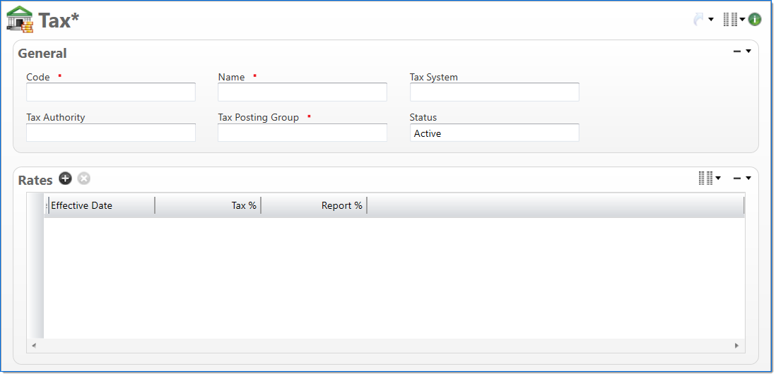 Enter or select the tax posting group. The Tax Posting Group determines the general ledger accounts used to record tax during financial transactions. Only active Tax Posting Groups with a matching Tax System can be selected. |