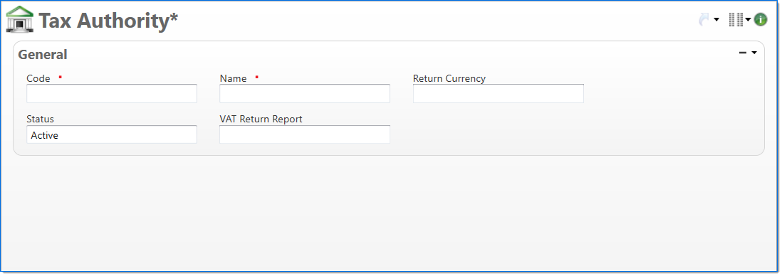 The Tax Authority screen allows you to define an entity to which Taxes are reported. This is used for reporting purposes to select the taxes being reported.