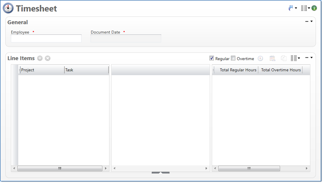 See Also: For information on the other available views for Timesheet, see Timesheet (Simple View) and Timesheet (Extended View).