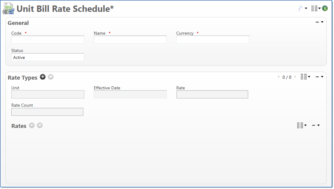 In the Rate Types area, enter or select the rate types associated with the unit bill rate schedule. This allows you to enter various rates controlled by the Effective Date for the unit.