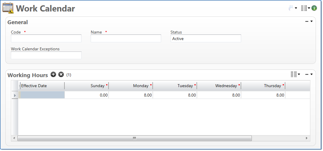 The Work Calendar screen allows you to add and define the work hours and exceptions for each day of the week.