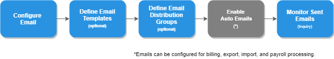 For automated emails, you will need to configure emails in the system, create any needed templates or distribution groups, and then enable automated emails. Automated emails can be enabled for billing, export, import, and payroll processing. You can also monitor sent emails.