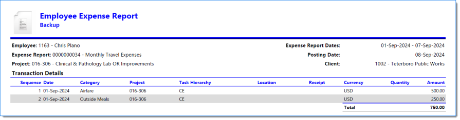 Example of Expense Report when Include Report is selected