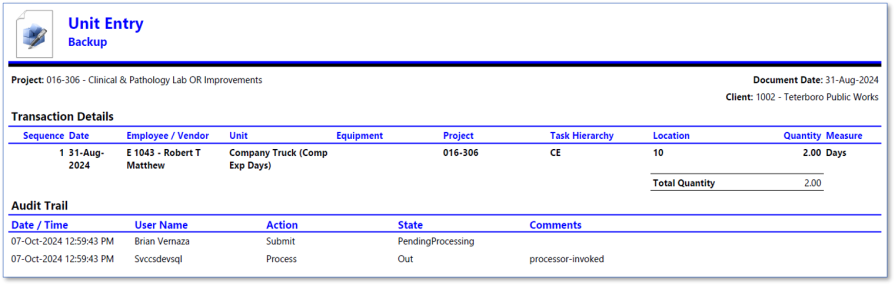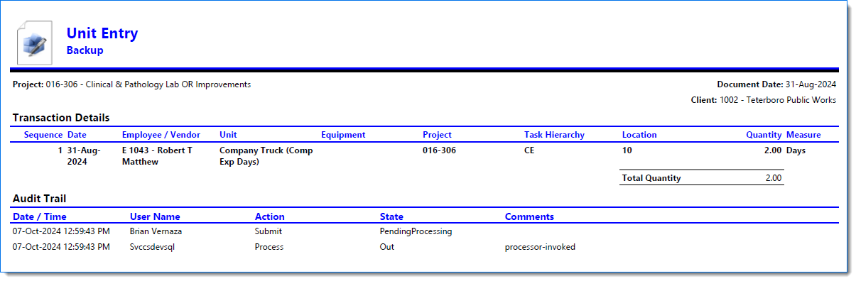 Example of Unit Entry report where Show Zero Effort is selected