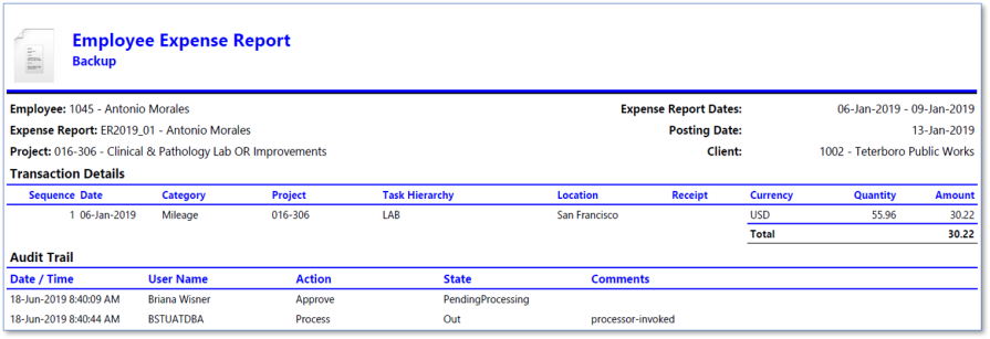 Example where an individual copy of the report is included in the backup packet per task where transactions are posted