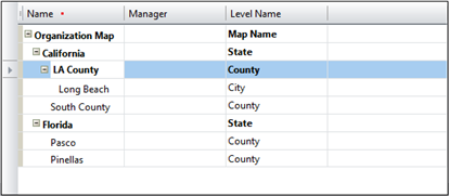 The Map area allows you to define the hierarchical structure of the map. This can be used in reports to determine how information is grouped and displayed. To create a map structure, you must add map items and use the hierarchical list features, like indent or outdent, to position each map item in the structure. The indentation of the value in the Name column displays where the map item falls in the hierarchy.